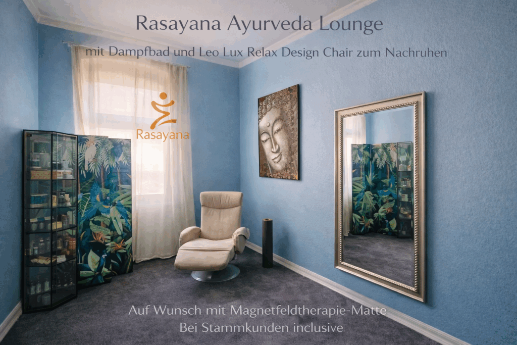 Ayurveda Lounge mit Leo Lux Relax Chair, zur Entspannung nach dem Dampfbad, oder für die Hypnose Sessions.